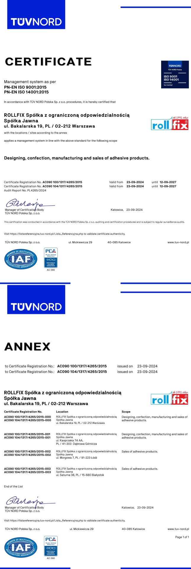 ROLLFIX is present on the polish market since 1991. Our main goal is production and distribution of pressure sensitive goods. In our offer you can find, not only pressure sensitive tapes, but also other materials in self-adhesive form, such as metal, rubber, textile, leather, brushes and cork etc.